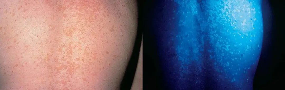 在紫外线灯下,受感染的皮肤可能会显示出黄绿色的荧光,这有助于确认真菌感染。