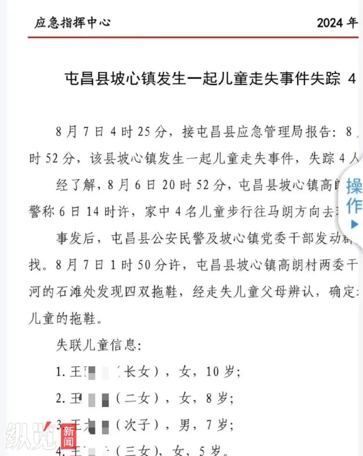 8月8日,网络上流传的一份文件截图称,海南省屯昌县坡心镇高朗村4名儿童失联。8月8日晚,4名儿童的父亲王先生告诉记者,姐弟4人已经不幸溺亡,目前还不清楚孩子溺亡的具体原因。