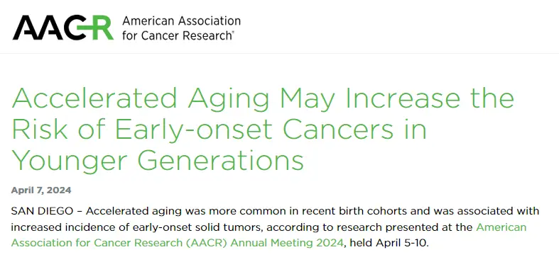 不仅如此,和老一辈相比,年轻人更容易加速衰老!2024年4月,美国癌症研究协会(AACR)年会上发布了一项研究显示:年轻人或正在加速衰老,并且加速衰老与癌症风险增加有关。与1950年-1954年出生的人相比,1965年或以后出生的人出现加速衰老的风险高17%。